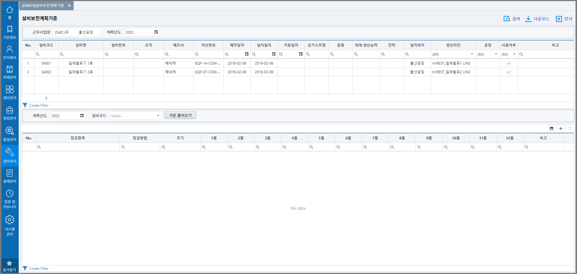 | 재고 | 외주관리 | 출하계획 | 출하검사 | 예비품관리 | 점검관리 |