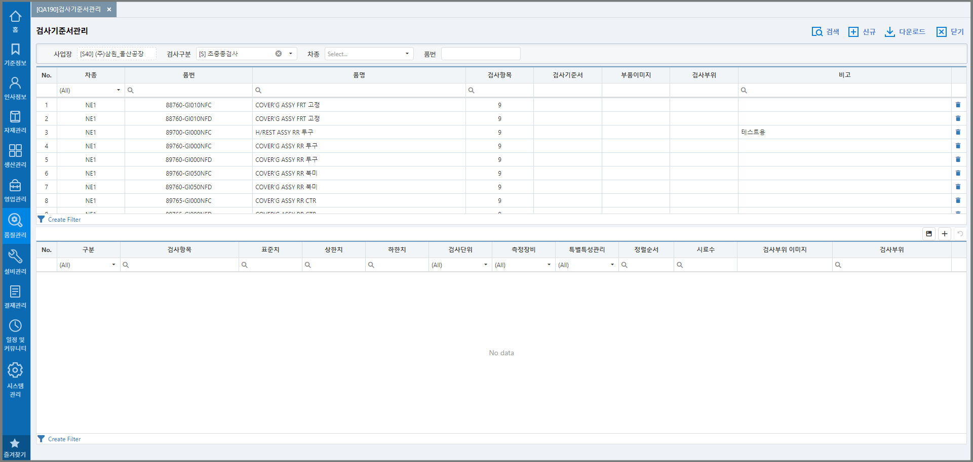 | 품번마스터 | 작업장마스터 | 부적합코드 | 용어마스터 | 메뉴마스터 | 사용자마스터 |