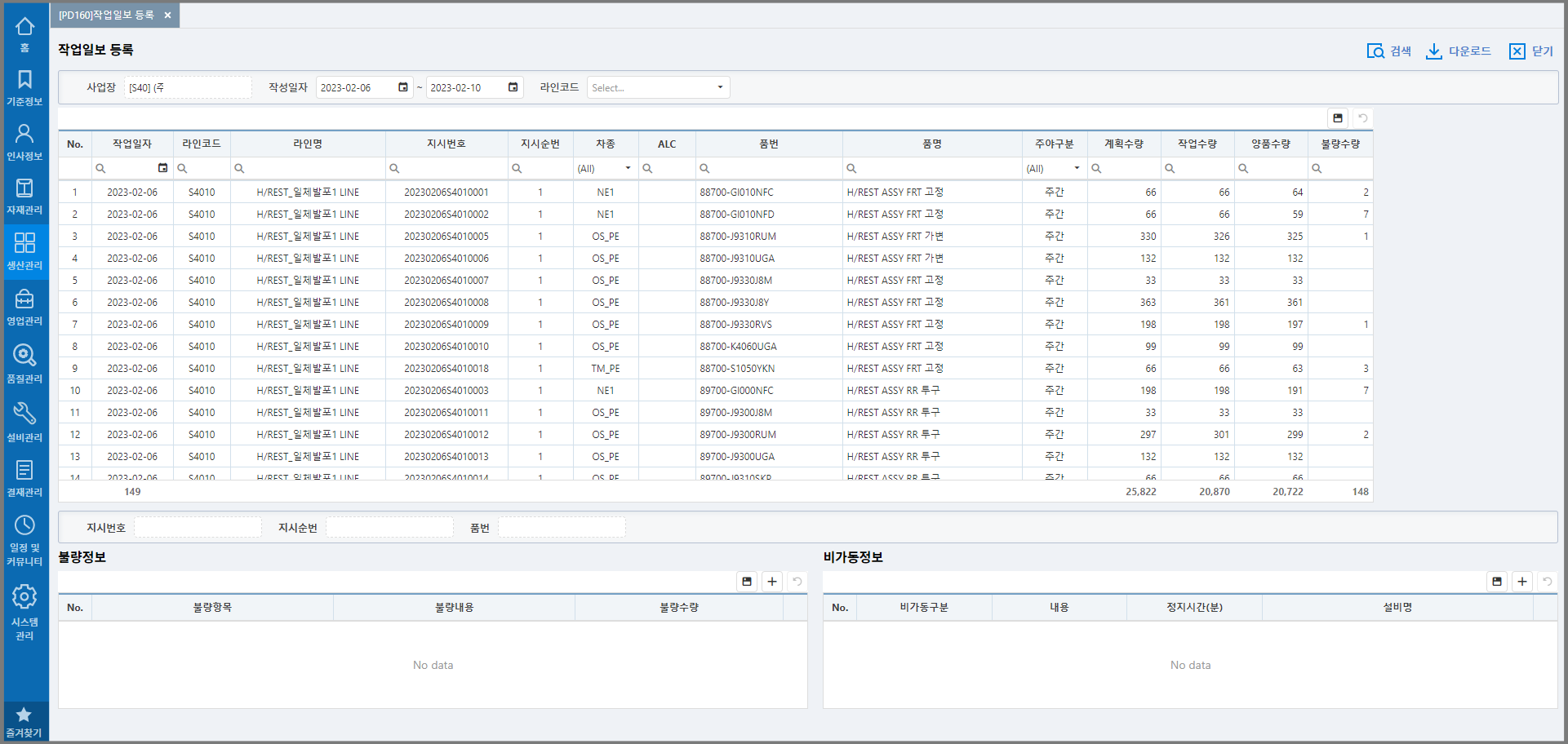 | 라벨발행 | 생산실적 | 재고 | 순희검사 | 수리이력 | 타발수관리 |