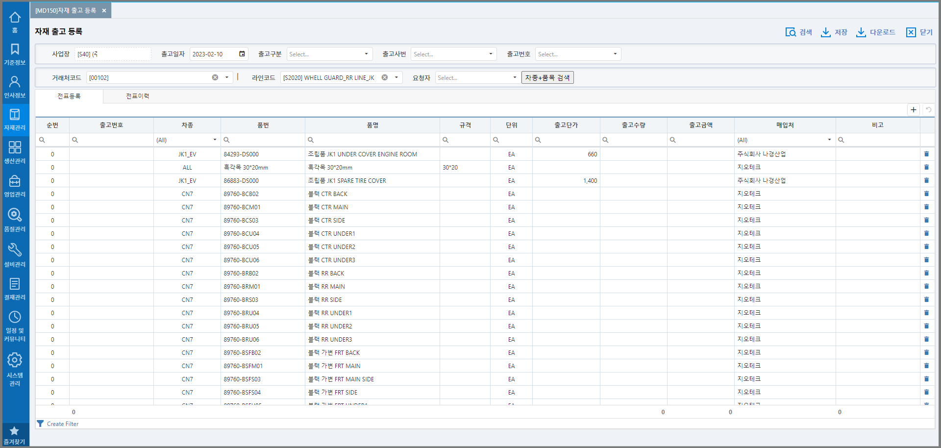 | 출고 | 포장관리 | 출고 | 공정능력 | 치공구관리 | 수리이력 |
