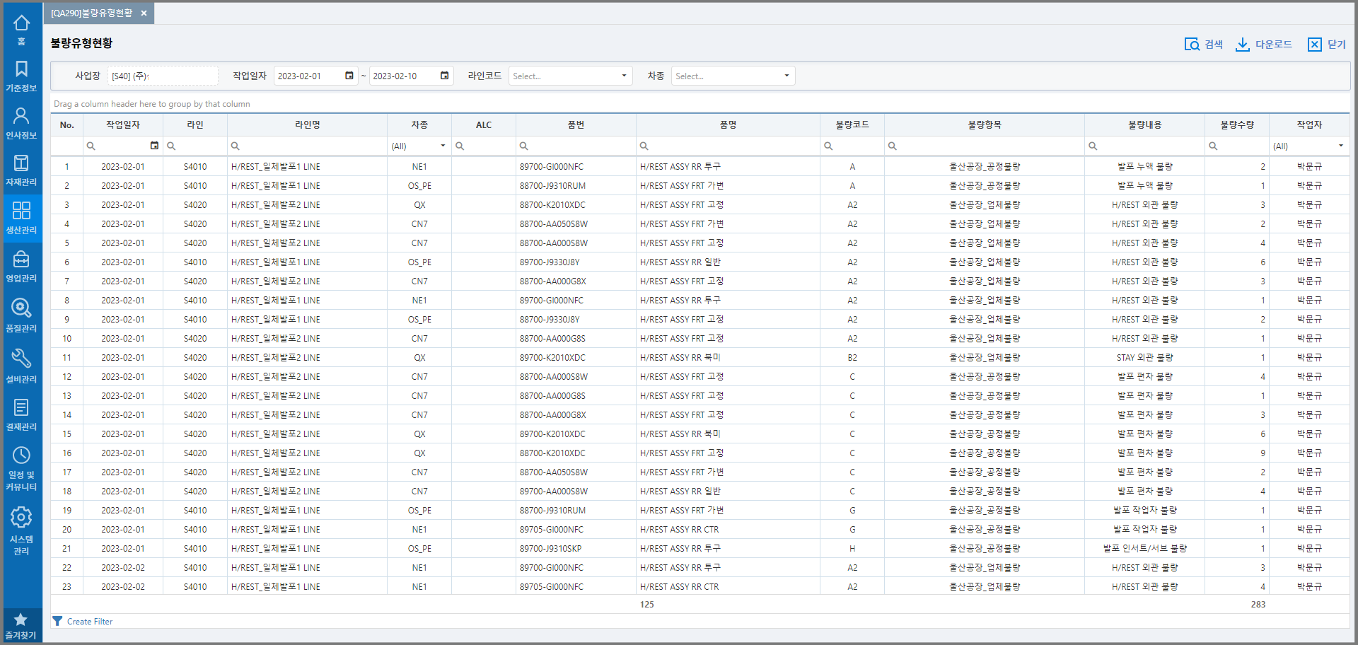 | 품번마스터 | 작업장마스터 | 부적합코드 | 용어마스터 | 메뉴마스터 | 사용자마스터 |