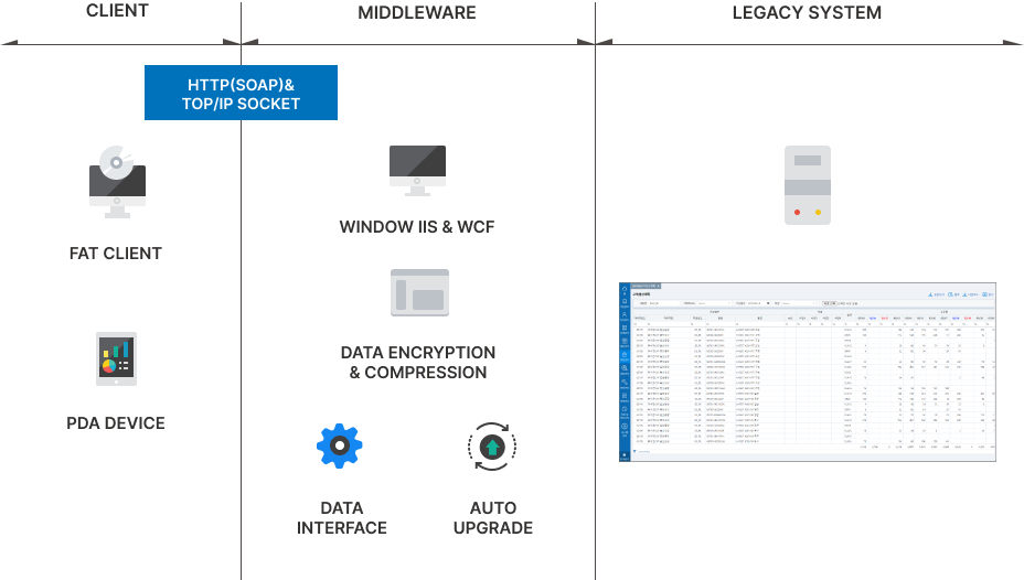 MES 패키지는 WCF 서비스를 기반으로 사무실, 집, 국내외 출장지 등 장소에 상관없이 시스템을 사용할 수 있으며, 관리자 및 사용자가 쉽게 설치 할 수 있도록 설치용 웹 페이지를 제공합니다. 패키지 구성은 관리자용 프로그램, 현장수집 POP, PDA 프로그램, 스마트폰, 모니터링 프로그램으로 구성되어 있습니다.